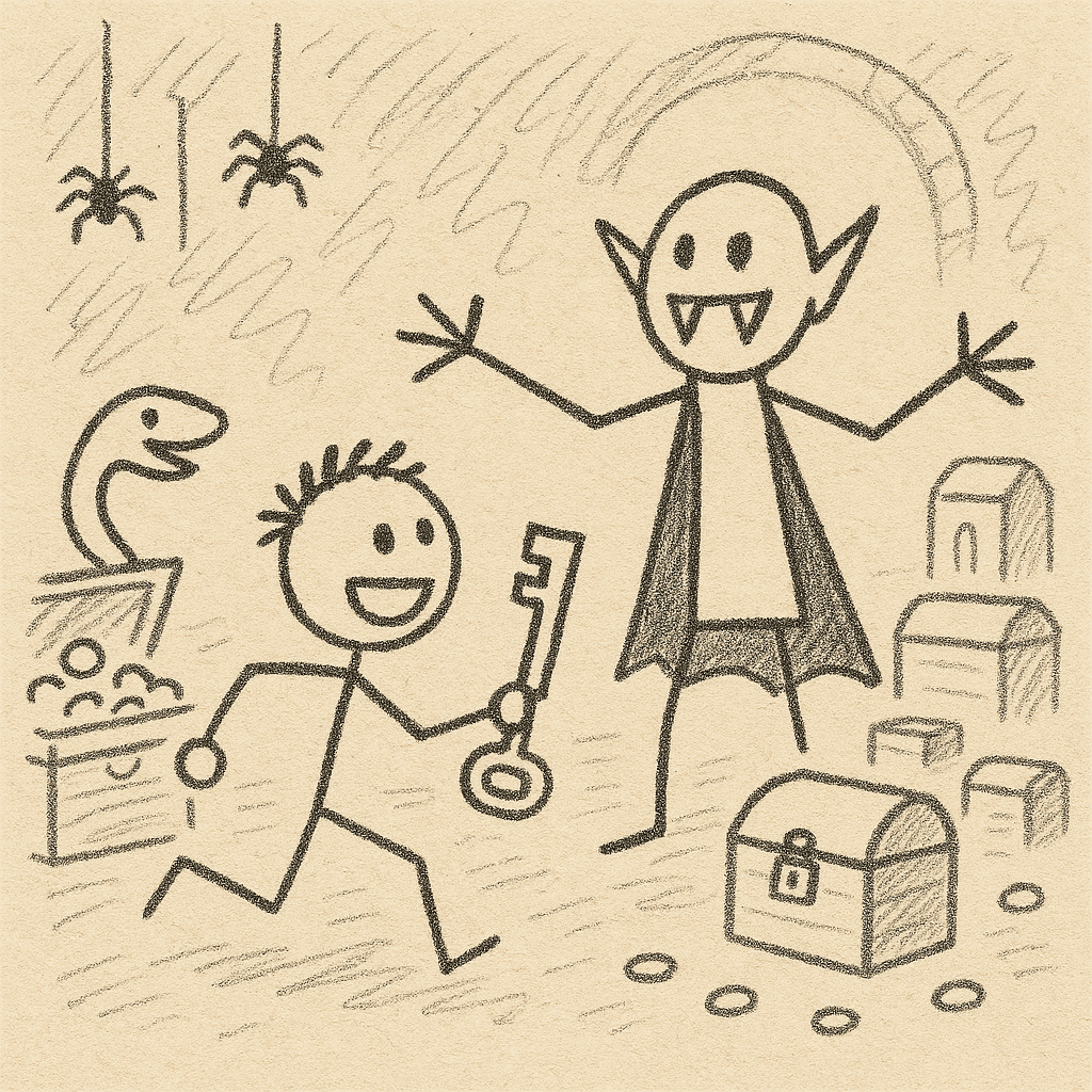 After a while, I got thirsty, so I left the others in search of something to drink. Did you know that vampires love spiders? I sure didn’t. But his pet spiders were everywhere, and boy, were they chatty! Mostly, they were excited because they’ve never seen flies as plentiful as they are right now. I guess the spiders are good friends with the flies. Or something. I couldn’t quite catch what they were saying because they were all talking at once. I think a few of them said something about corpses.